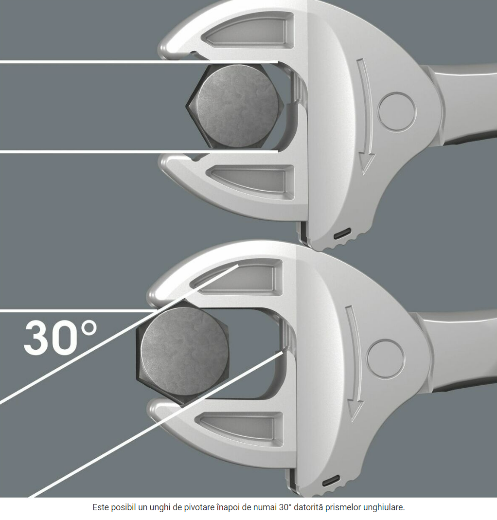 • Unghi de pivotare înapoi extrem de mic de doar 30° datorită prinderii cu prismele unghiulare ale fălcilor.
