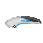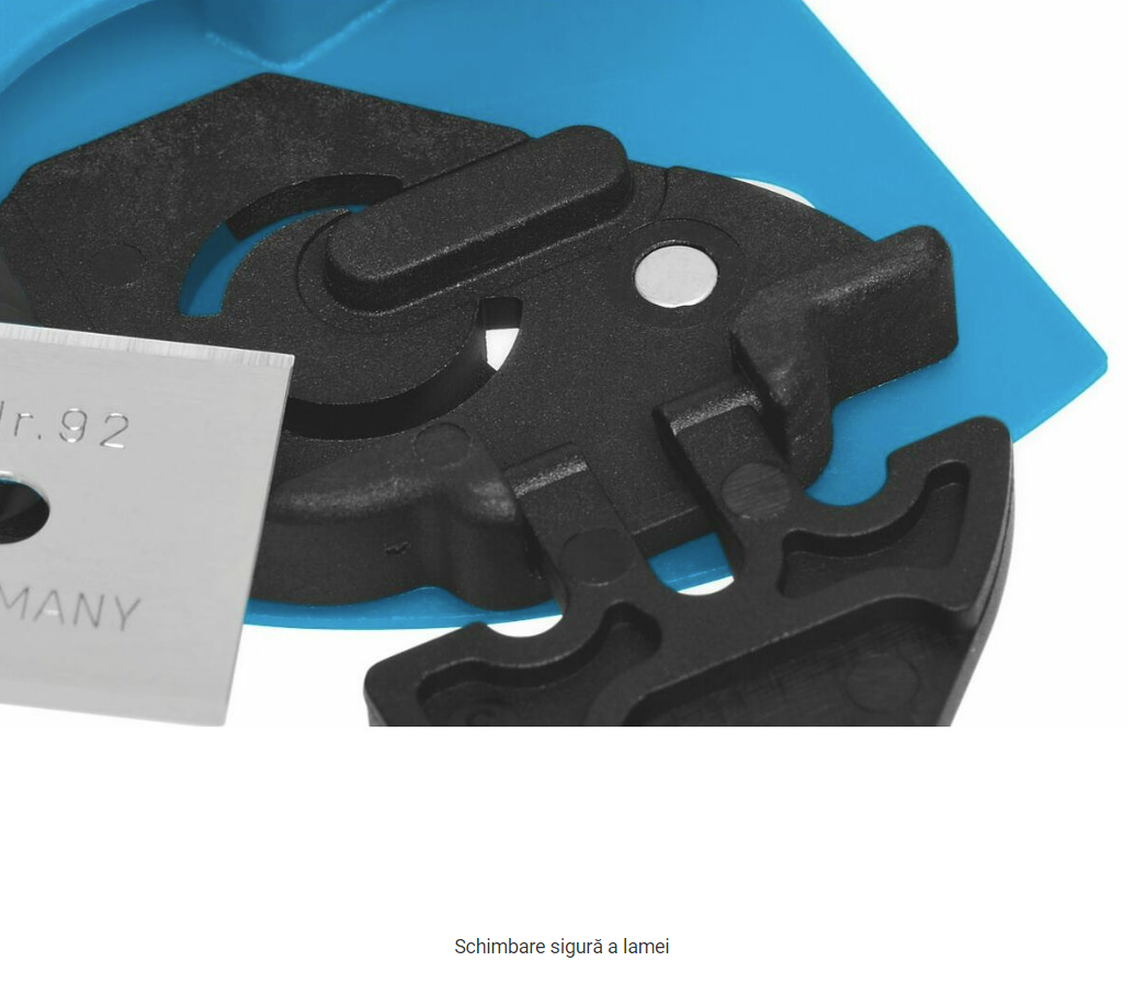Cuţit de siguranţă cu adâncime de tăiere de 9 mm şi retragere complet automată a lamei. Mâner ergonomic din aluminiu pentru cleşte (inclusiv mâner moale pentru fixare optimă), cu o pârghie cu mişcare lină pentru declanşarea lamei. Schimb sigur şi confortabil al lamei, care se poate folosi în 4 moduri.