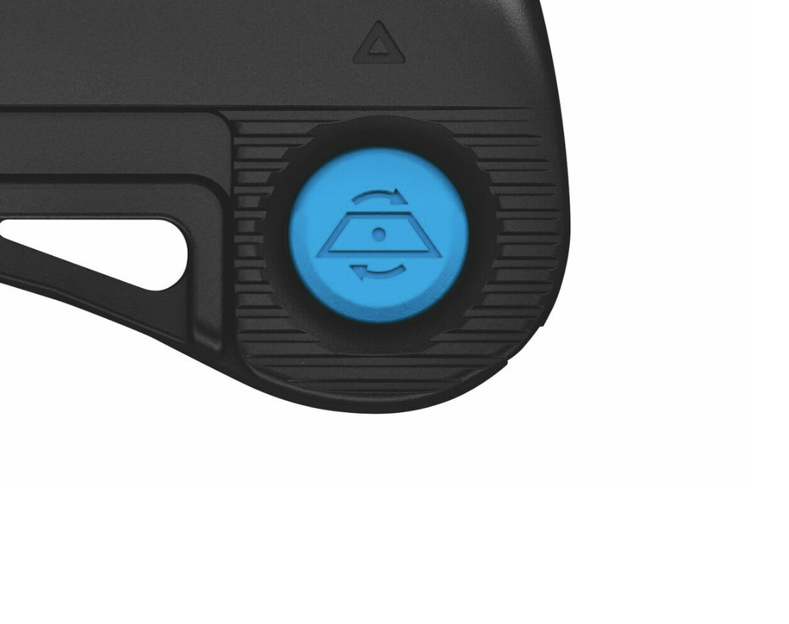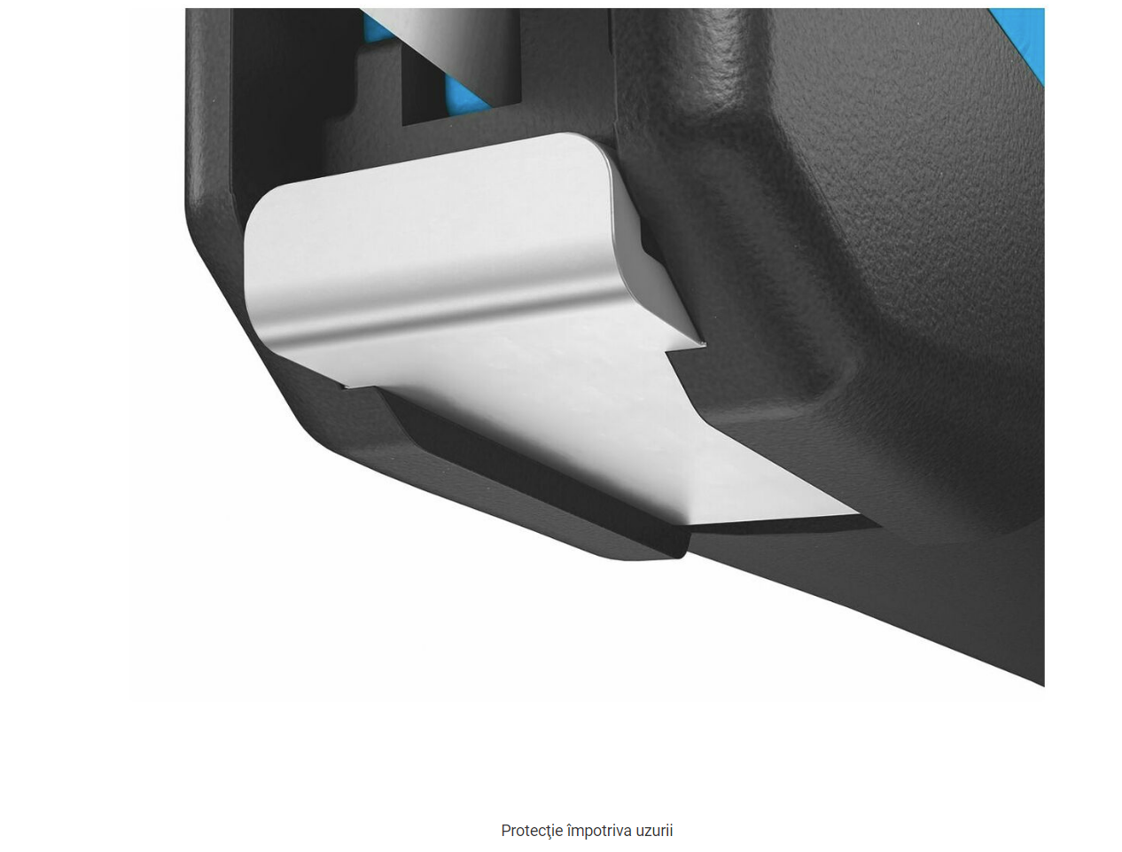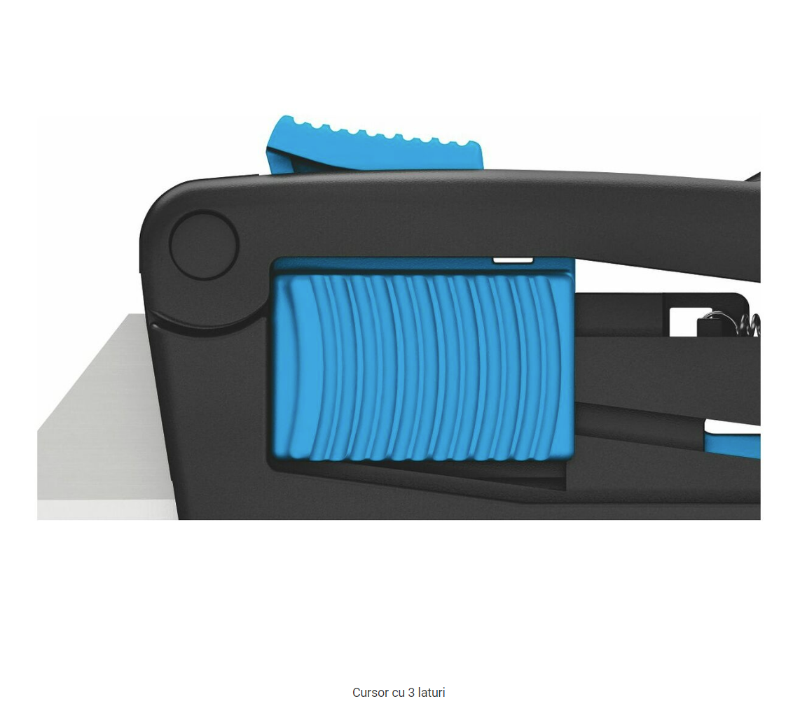 Cuţit de siguranţă cu cursor pe 3 părţiadâncime de tăiere de 16 mm şi retragere complet automată a lamei. Mâner ergonomic optimizat din material plastic ranforsat cu fibră de sticlă şi element metalic sub lamă pentru o protecţie crescută împotriva frecării. Schimb sigur şi confortabil al lamei, care se poate folosi în 2 moduri.