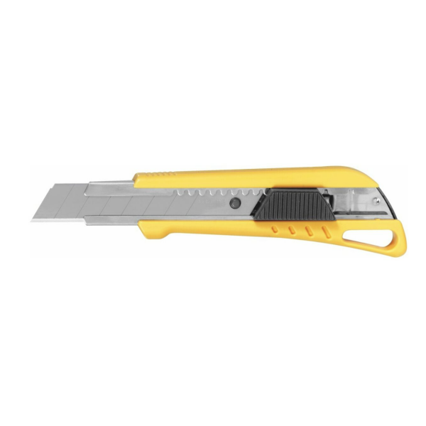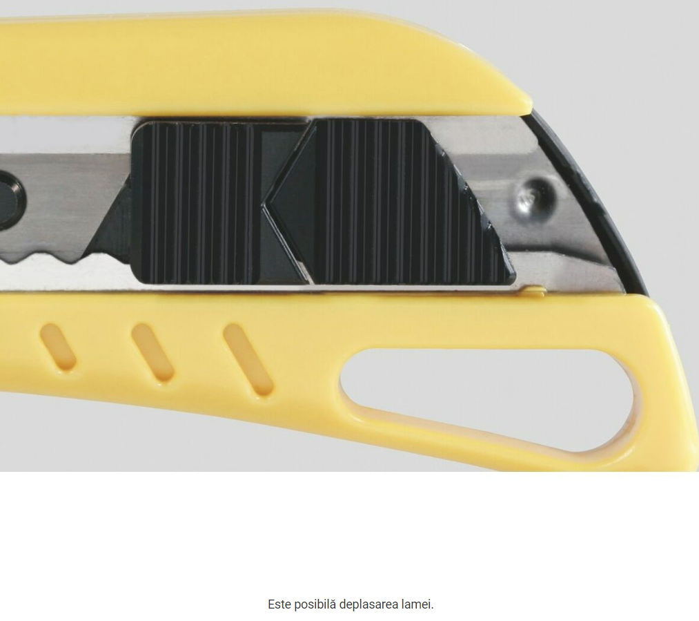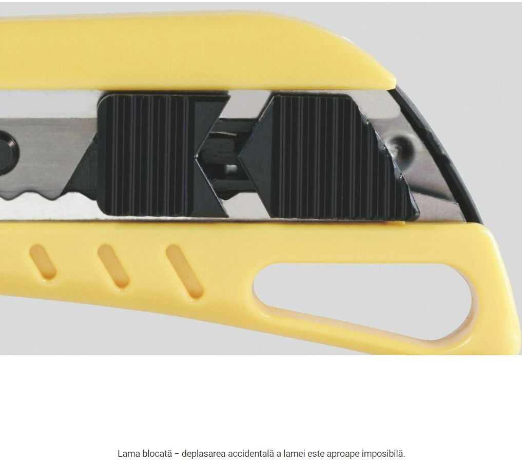 Mâner din plastic rezistent la şocuri, cu 3 lame de rupere în 8 trepte, lăţime 18mm. Mecanism de blocare integrat în cursor.