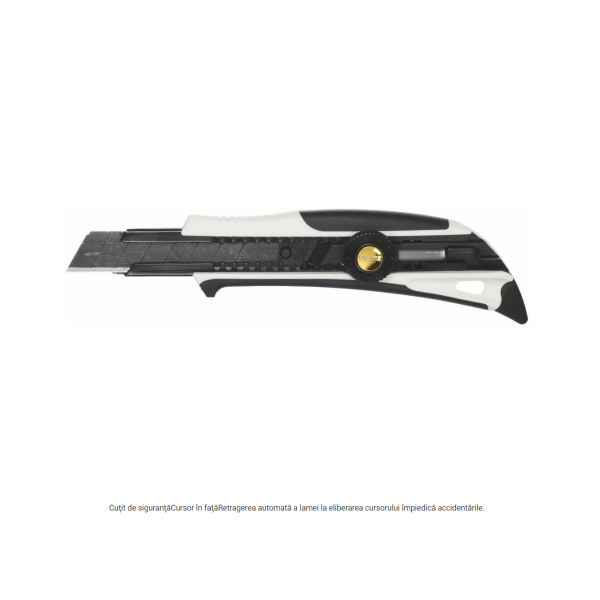 Mâner ergonomic din 2 componente şi ghidaj precis al lamei. Lama se blochează automat. Vârf multifuncţional pe ghidajul lamei pentru deschiderea dozelor, funcţie de şurubelniţă, pentru deschiderea ambalajelor etc. Suplimentar, o aripioară de metal la capătul mânerului, pentru deschiderea ambalajelor de carton. Cu 1 lamă de rupere (Cod 845021 Ref. 10) în 8 trepte. 18 mm lăţime.