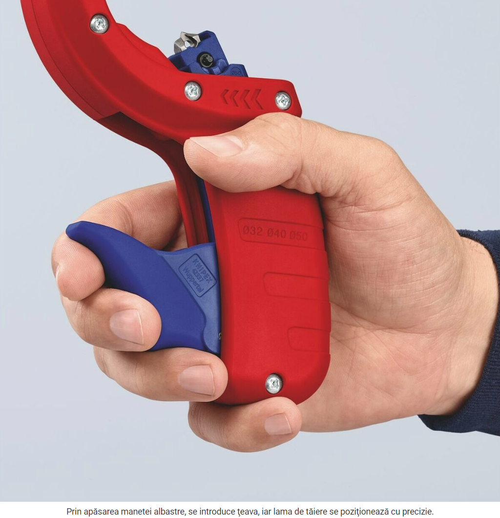 Corpul sculei este din plastic armat cu fibră de sticlă. Lamă reversibilă care se poate schimba fără scule, din oţel de înaltă calitate pentru rulmenţi. Ghidare optimă a ţevilor şi tăiere uşoară datorită rolelor cu lagăr de alunecare şi cu autoreglare. Datorită lamei tăietoare cu arc, nu este necesară o ajustare solicitantă în timpul tăierii.